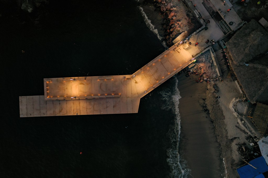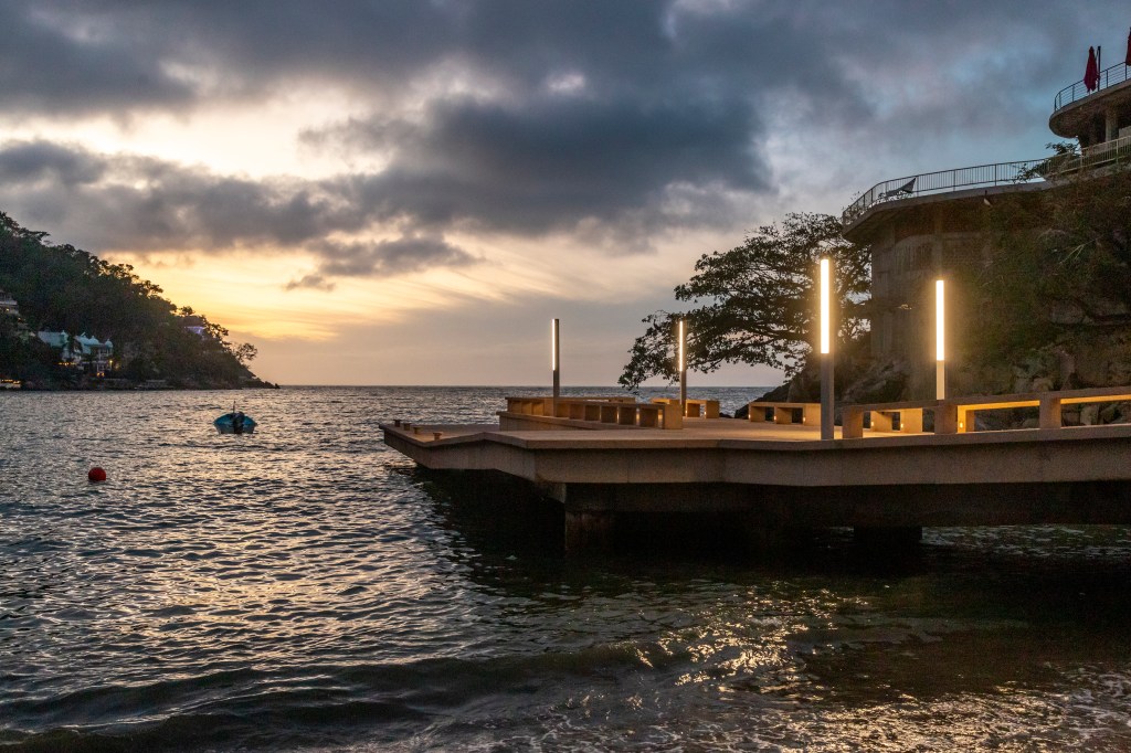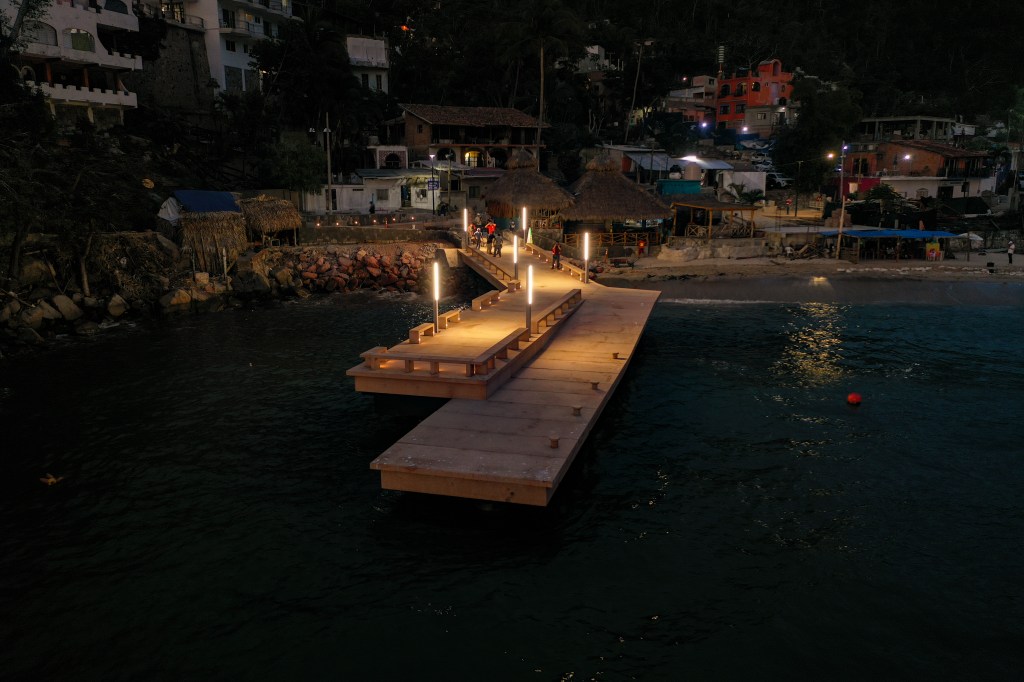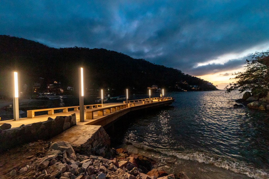 El recorrido del malecón comienza en el Estero, envuelto por manglares y donde se integró un módulo de venta que permite que los pescadores ofrezcan sus productos de manera directa. Conforme se avanza en dirección al mar, el visitante va encontrando los muelles flotantes que permiten el abordaje a las embarcaciones de pesca y de servicios turísticos. Al centro del andador se construyeron estructuras pergoladas que ofrecen un espacio sombreado para quienes se encuentran a la espera de una nave, o bien, para quienes realizan alguna otra actividad. Además de las pérgolas se colocó vegetación que aporta a la calidad visual y ambiental del sitio. La obra consideró otros espacios que alojan servicios requeridos por los visitantes, como módulo de baños y regaderas, y un área operativa para los pescadores. El malecón remata con un muelle de más de 35 metros de longitud que al llegar al final del espigón permite a los visitantes adentrarse en el mar y apreciar la totalidad de la bahía de Punta Pérula.