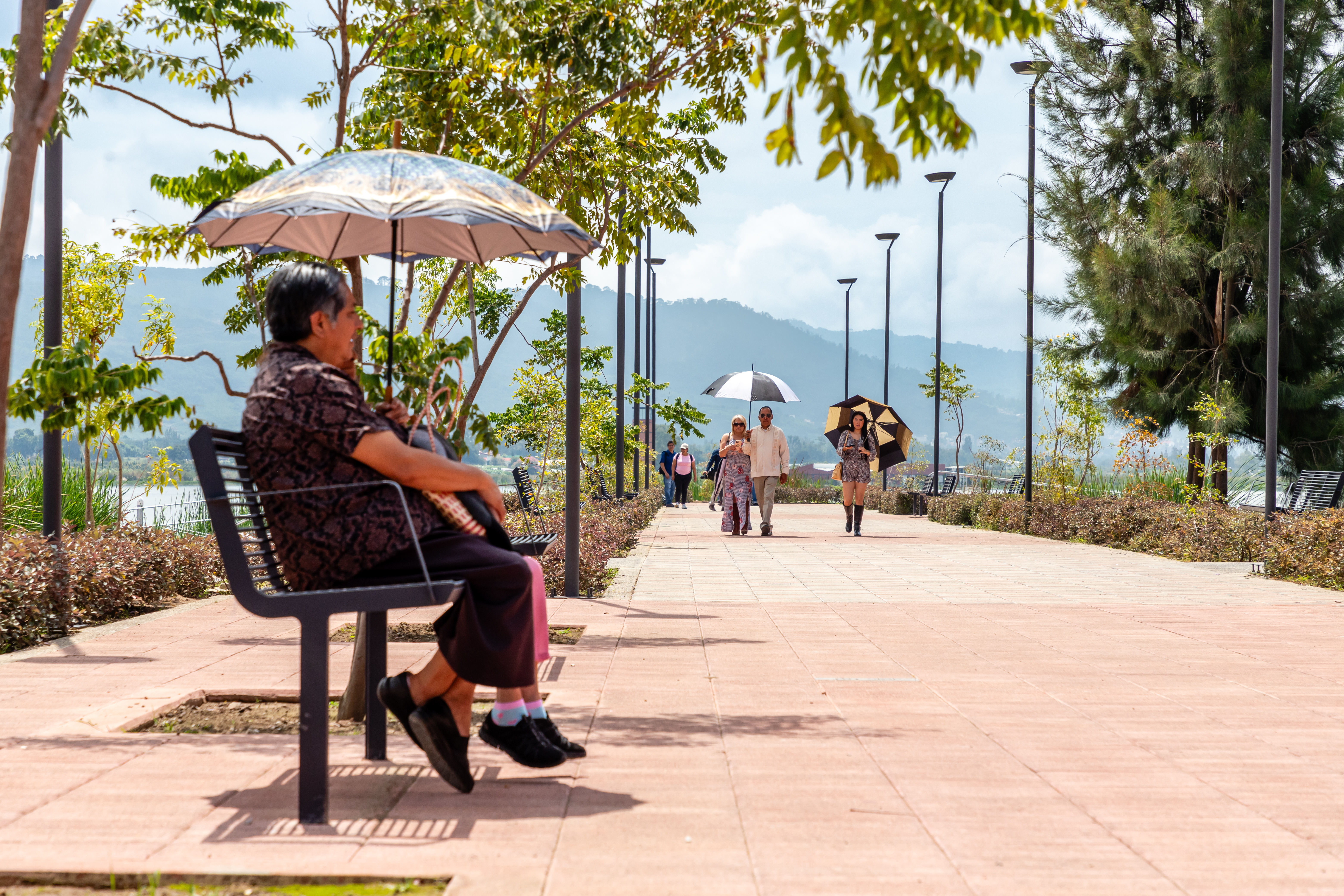 El andador de acceso a este espacio está conformado por adoquines prefabricados de concreto, guarniciones, bancas prefabricadas, iluminación ambiental y vegetación complementaria, incluyendo arbolado y cubresuelos.