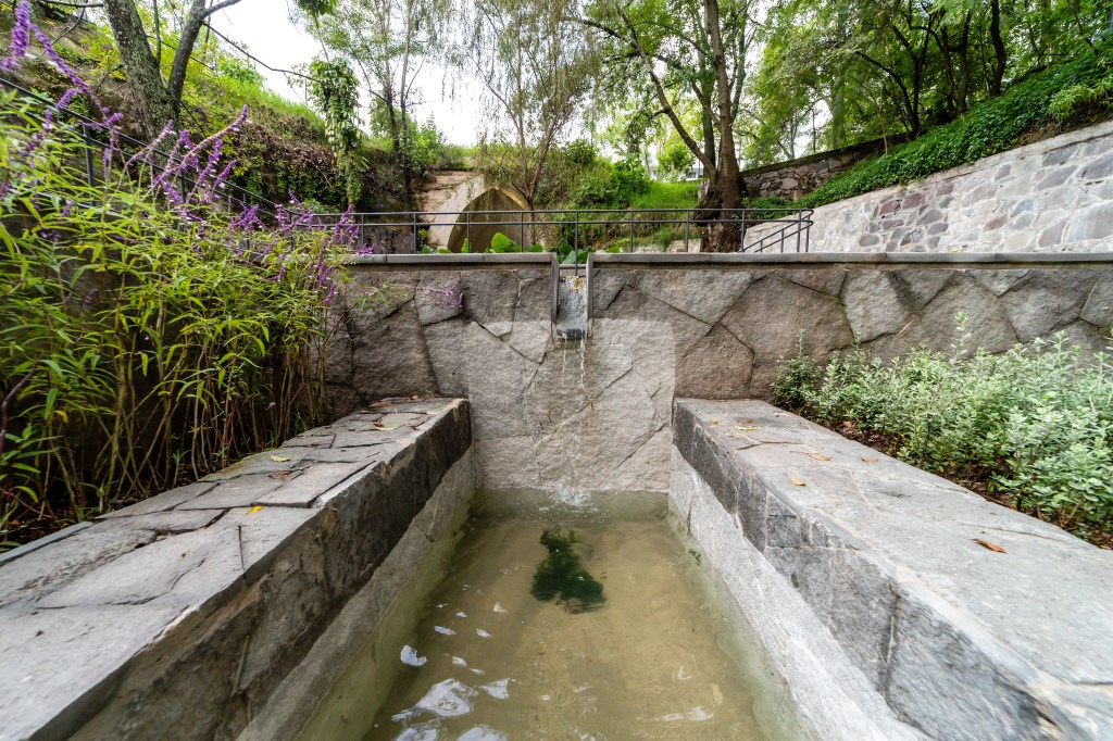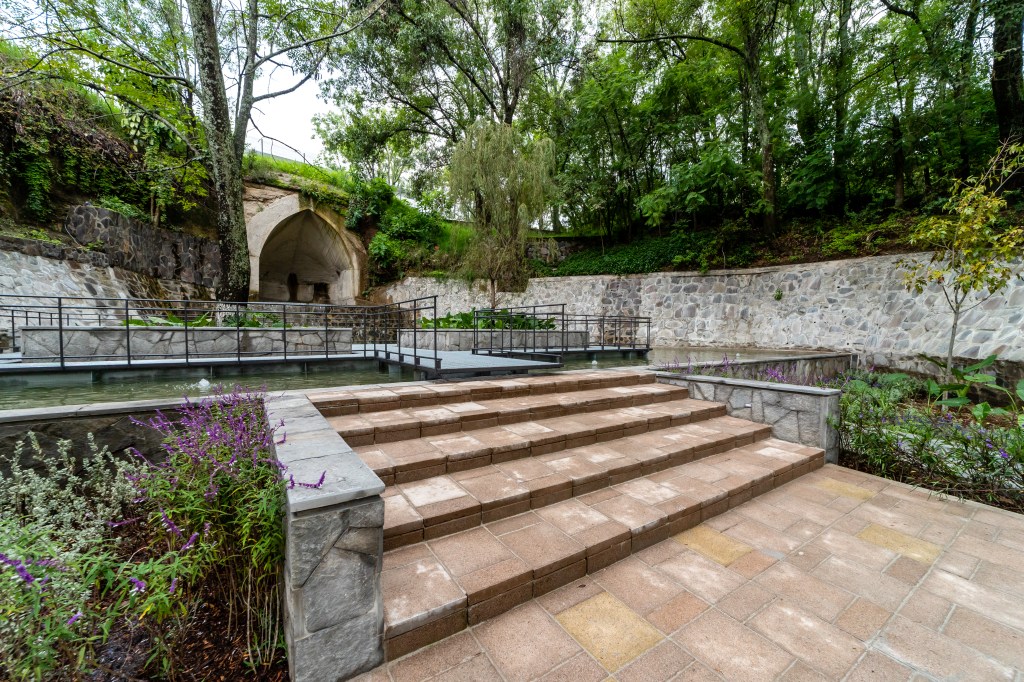 La obra contempló la restauración de la bóveda original, muros de contención y pilas de agua diseñadas por Ashida y Hartung. Además, se buscó crear una atmósfera que conectara a los visitantes con la naturaleza. Para ello, se propuso una pila a nivel de piso equipada con un sistema de borbotones que emiten sonido, así como una pasarela de rejilla tipo Irving, pasamanos de tubulares rolados y jardineras-banca que alojan dos árboles como principales actores del espacio.