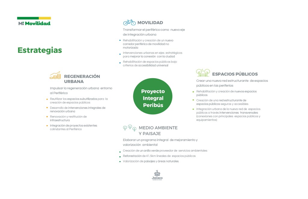 El proyecto contempla 41.5 km de intervención, desde Carretera a Chapala a Belisario.Estrategias del proyecto Integral para la Renovación de Periférico.