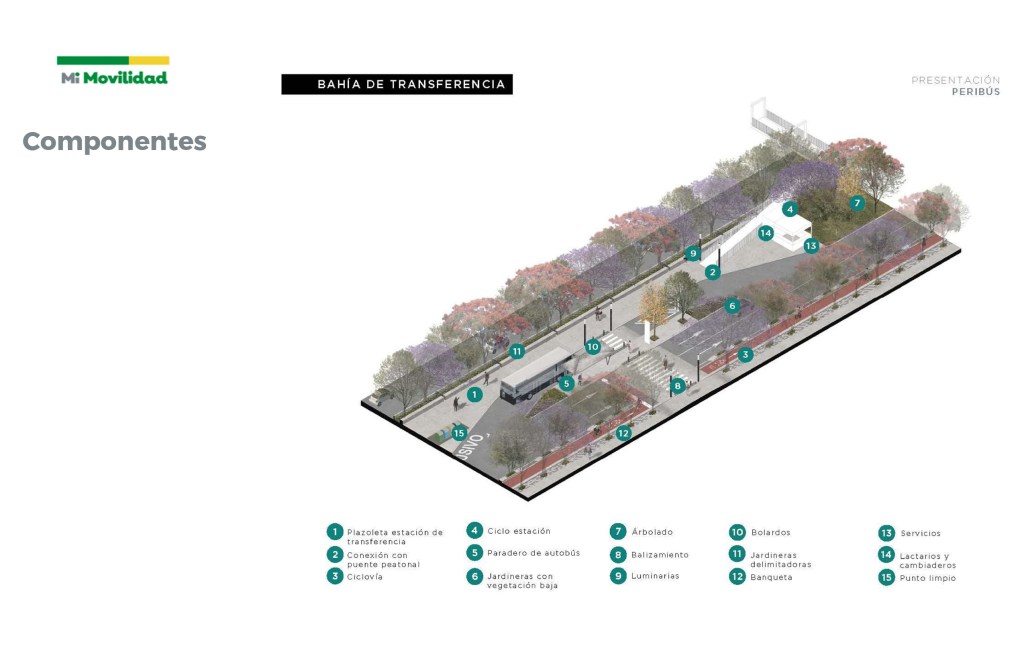 Este corredor contempla la renovación de 41.5 km de carriles centrales y laterales, 46 estaciones de transporte BRT, puentes peatonales (rampas accesibles y elevadores, construcción de entornos urbanos con módulos de servicio (lactario, sanitarios, ciclopuertos y espacios de atención al usuario), bahías de ascenso y descenso de rutas alimentadoras, ciclovía confinada, banquetas accesibles con arbolado e iluminación, cruces seguros, señalética vertical y horizontal, patios de encierro y edificios administrativos para la operación del Sistema de Transporte Mi Macro Periférico.