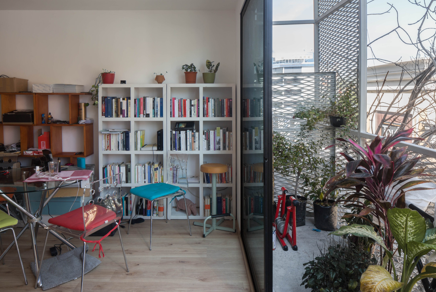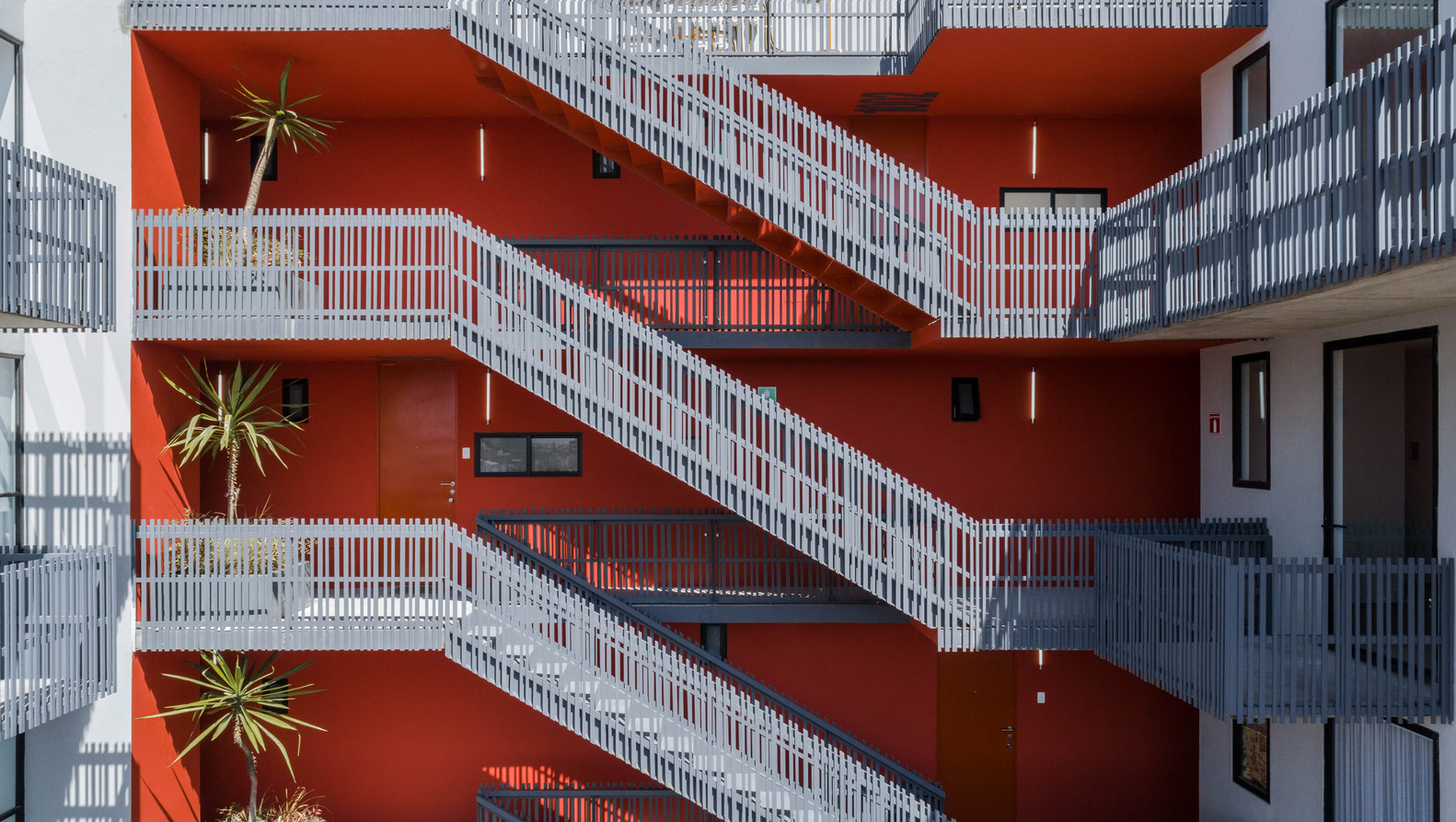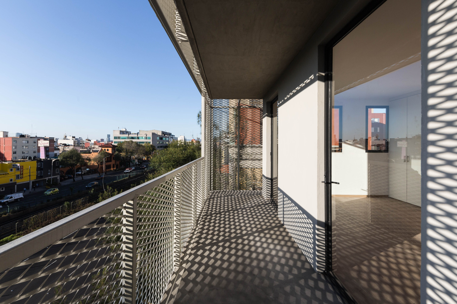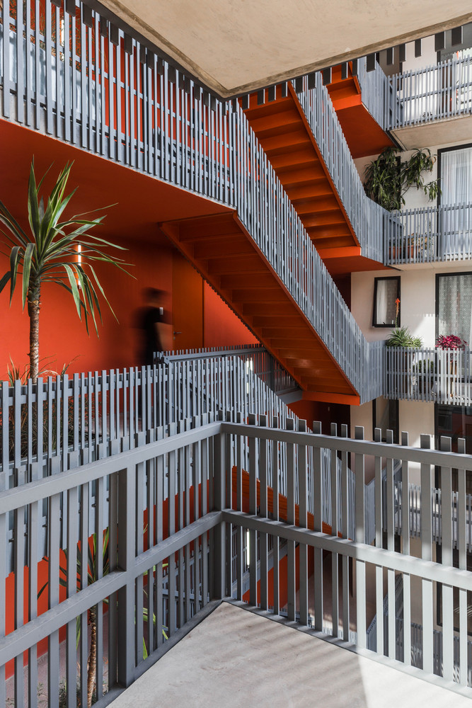En la fachada lateral, la malla rompe su uniformidad y adopta formas lúdicas que reflejan la diversidad tipológica de los departamentos, funcionando como una transposición vertical de la inventiva formal del barrio. El conjunto alberga 52 viviendas organizadas en 12 tipologías distintas, posibles gracias a una estructura altamente racional que permite combinar unidades de uno y dos niveles. A pesar de sus superficies contenidas (60 a 70 m²), los departamentos ofrecen programas eficientes de dos y tres recámaras, amplias áreas de sala-comedor y balcones que amplían el espacio habitable y enmarcan vistas abiertas hacia la ciudad.